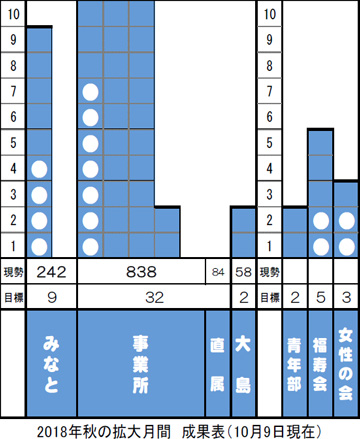 秋の拡大月間の目標は年間12.0%の拡大到達を基本目標(月間中での到達)に、1月現勢の3.5%43人(みなと分会9人、事業所分会32人、大島分会2人)の拡大と、新規事業所2社の加入を目標とします。5日現在、11人(みなと分会4人、事業所分会7人、大島分会0人)の到達となっています。